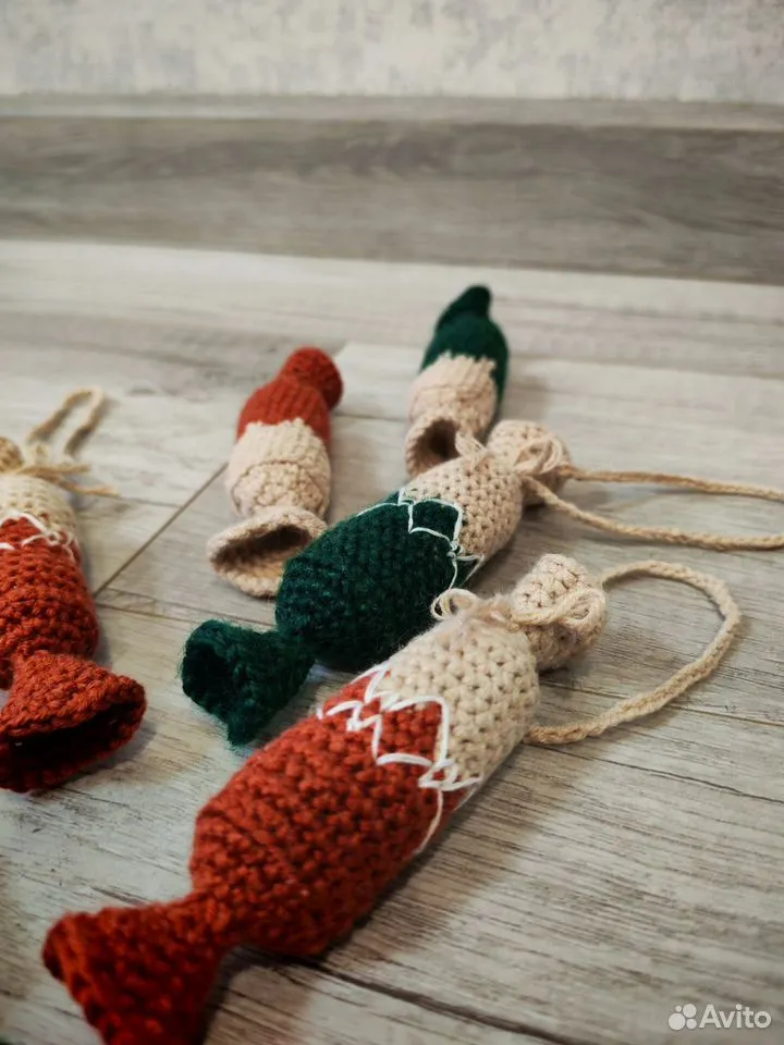 Елочное украшение в виде знаменитого батончика «Рот Фронт» изготовлено вручную. Игрушка точно воспроизводит цветовую гамму и силуэт конфеты. Её размер — 11 см.
