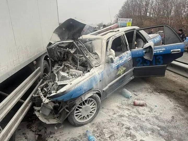 Патрульный автомобиль загорелся после столкновения с грузовиком в ходе преследования мотоциклиста.