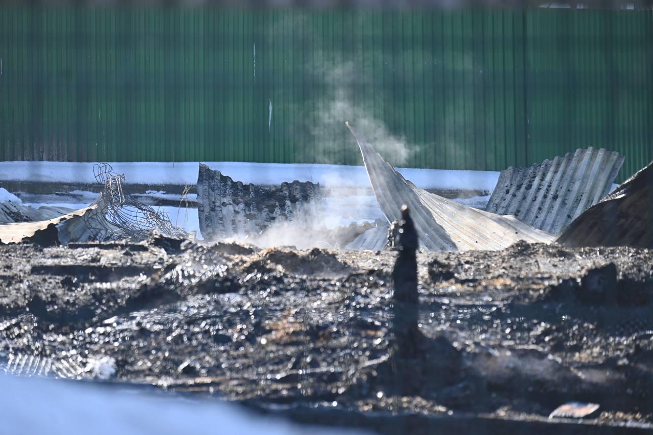 На территории видны обугленные каркасы сгоревших построек. Земля вокруг покрыта пеплом и усеяна обгоревшими деревянными элементами. На месте до сих пор находится автомобиль МЧС, а также работают спасатели.