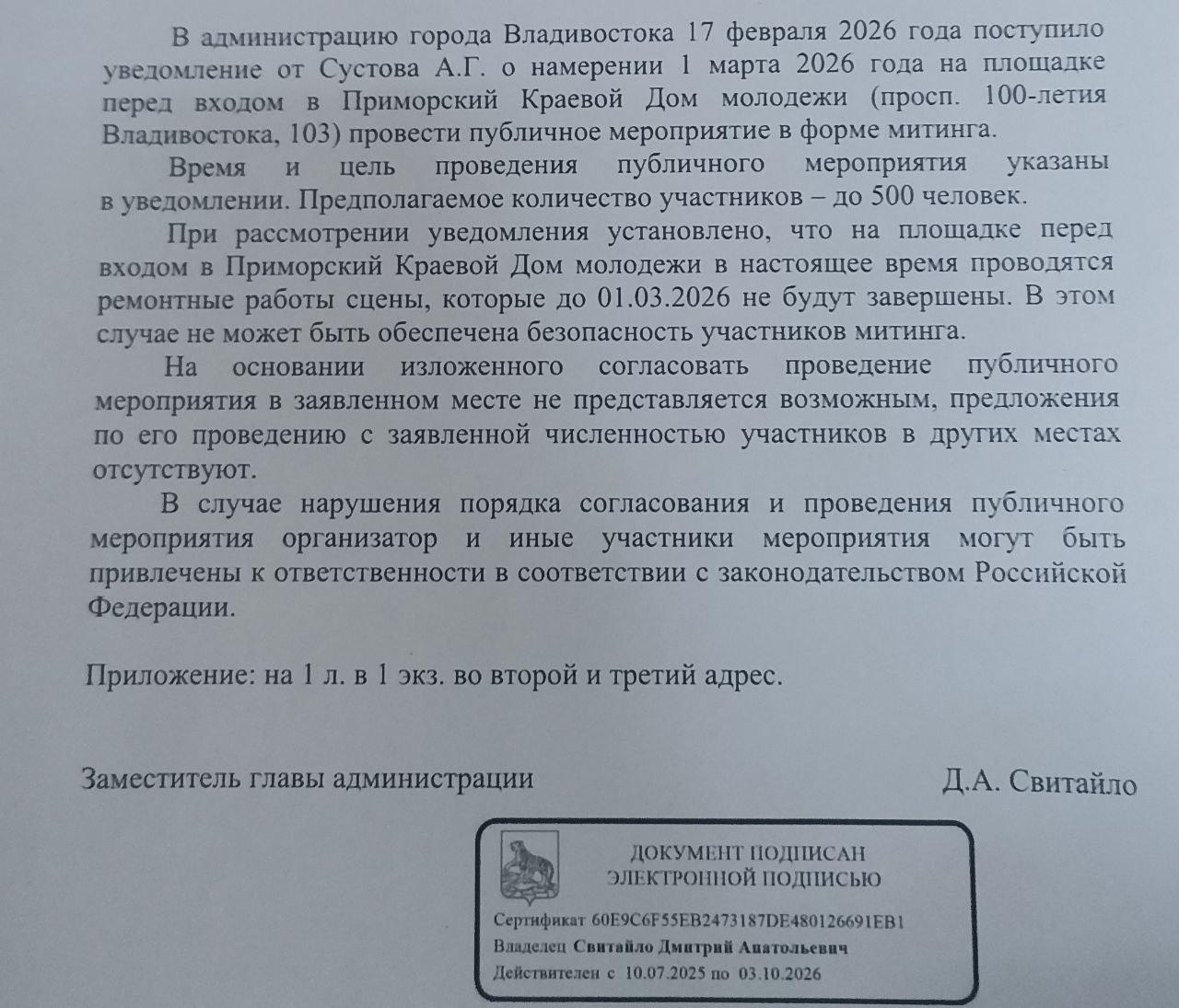 В ответе администрации указано, что проведение митинга 1 марта невозможно из-за ремонтных работ сцены перед Приморским краевым центром молодежи. На эти же работы власти ссылались еще в ноябре 2025 года, отказывая в проведении акции против утилизационного сбора. В документе говорится: «Начиная с третьей декады ноября 2025 года до весеннего периода 2026 года на площадке перед входом в Приморский краевой центр молодежи будут проводиться ремонтные работы, в том числе в отношении сцены и прилегающей территории».