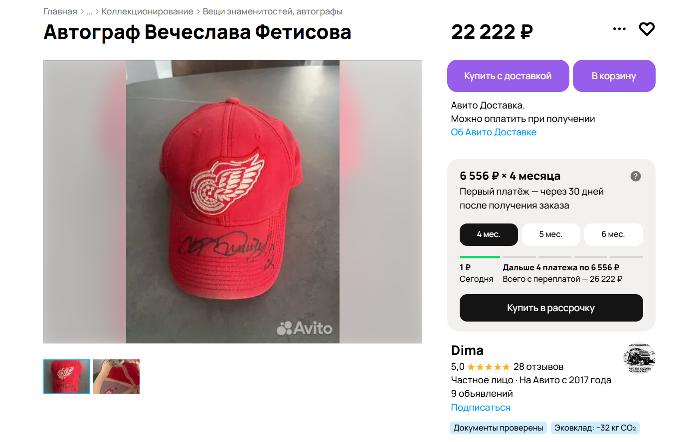 Коллекционный предмет появился на торговой площадке «Авито» во Владивостоке. Речь идет о красной бейсболке с автографом Вячеслава Фетисова, прославленного защитника советской сборной, входившего в знаменитую пятерку «Красной машины». Стоимость лота составляет 22 222 рубля, что является отсылкой к игровому номеру спортсмена.